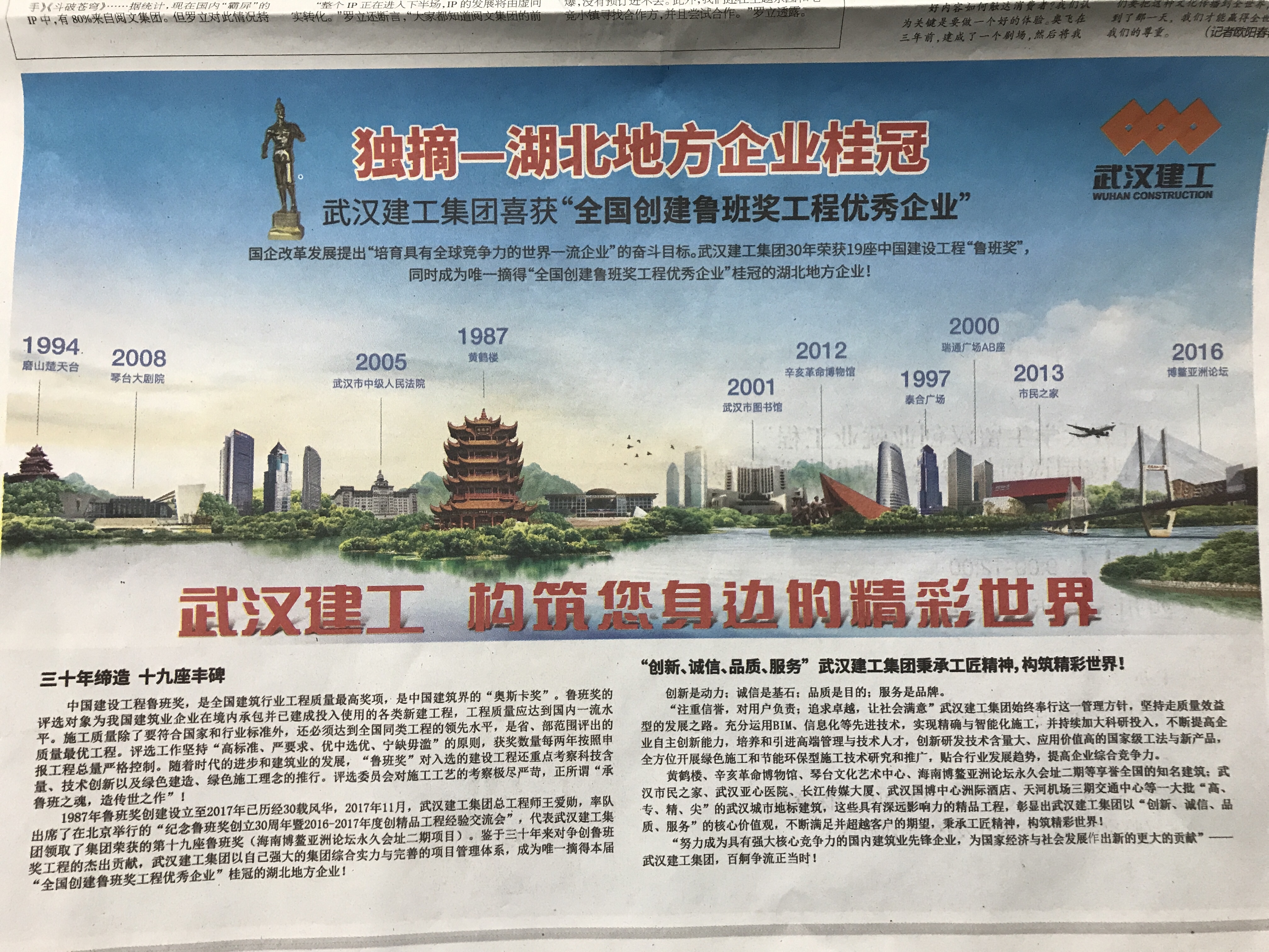 獨(dú)摘—湖北地方企業(yè)桂冠 武漢建工集團(tuán)喜獲“全國創(chuàng)建魯班獎(jiǎng)工程優(yōu)秀企業(yè)”